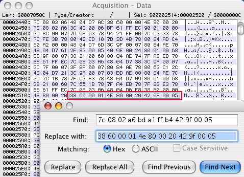 The cracker wrote: 7c0802a6bda1ffb4429f0005 <-- original chain of hex values -> <-- change to 386000014e800020429f0005 <-- new chain of hex values
